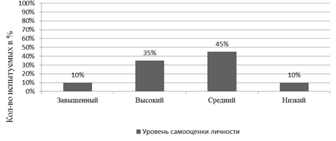Низкий уровень самооценки личности выявлен у 2 учащихся. На этом уровне дети испытывают тревожность, неуверенность, зависимость, усталость есть небольшие запасы прочности, отстраненность, замкнутость, тревожность, уход. Испытывают большие затруднения в межличностных отношениях, что не расходится с проведенными ранее исследованиями [5, 6].