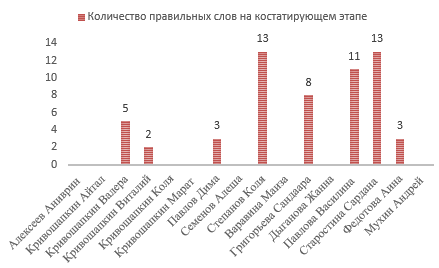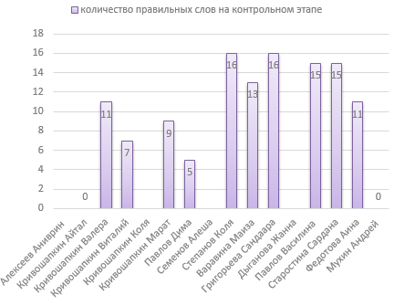 Контрольный этап опытно – практической работы был проведен через месяц, целью которого было отслеживание динамики развития памяти после апробации заданий. Материалом для контрольного этапа были те же группы слов, что и на констатирующем этапе. Результаты контрольного этапа исследования занесены в таблицу 2.