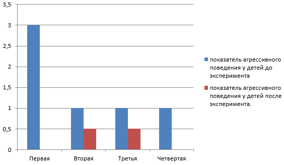 Сравнивая результаты эксперимента до и после коррекции, можно проследить изменение процентных данных и, показателей, которые соответствовали высокому уровню агрессивности. Формирующий эксперимент позволил проследить динамику снижения агрессивности детей 4-5 лет. В экспериментальной группе были получены результаты в пределах от 0 до 100%, что соответствует полному отсутствию агрессии в поведении у троих детей и низкому уровню проявлению агрессии у двоих.