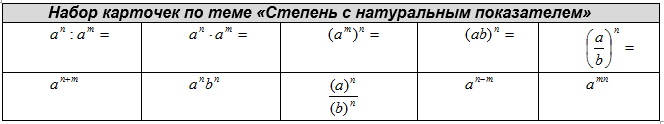 Например, набор карточек по теме «Степень с натуральным показателем» (Карточки разрезать)