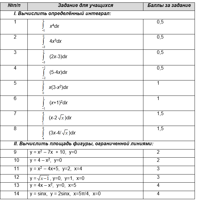 Например, набор заданий для зачётной работы по теме “Определённый интеграл. Площадь криволинейной трапеции”.
