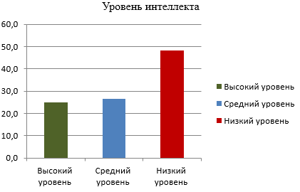 Как видно из таблицы, низкий уровень интеллекта отмечается у 48,2%. Полученные результаты дают нам основания говорить о недостаточной сформированности системы мыслительных операций (сравнения, анализа, синтеза, обобщения, абстрагирования) почти у половины первоклассников нашей выборки. Также, как видно из рисунка 1, высокий уровень имеют 25% учащихся, и средний уровень 26,7%. Это может означать, что они имеют более высокие интеллектуальные данные, а также имели интенсивную дошкольную подготовку.