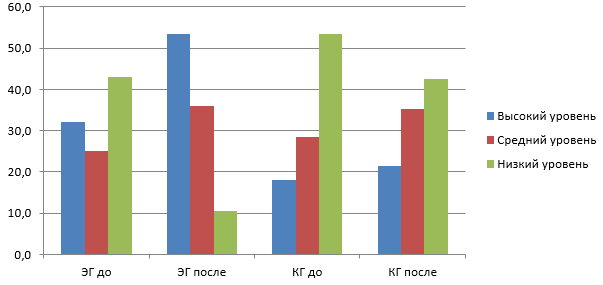 Как видно из рисунка 2, в экспериментальной группе уменьшается количество испытуемых с низким уровнем интеллекта и повышается количество первоклассников с высокими показателями. В тоже время в контрольной группе количество первоклассников с низким уровнем также снижается и возрастает с высоким и средним, но в незначительных показателях, которые явно видны на рисунке 2.