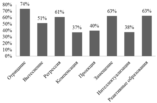 Рис. 1. Соотношение процентных показателей уровней психологических защит детей из приюта