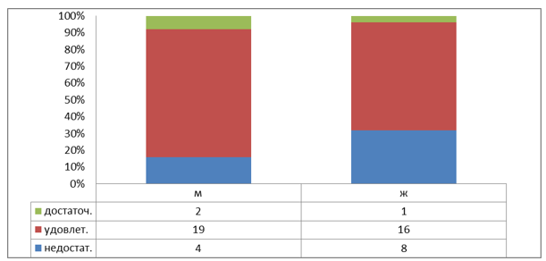 По результатам данного исследования можно сделать вывод о том, что в выборке испытуемых присутствует 24% респондента с недостаточной готовностью к семейной жизни, среди которых 8% составляют юноши, 16% - девушки. Достаточная психологическая готовность выявлена у 6% испытуемых, из которых 4% - юноши, 2% - девушки. Большую часть выборки составляют респонденты с удовлетворительной психологической готовностью к семейной жизни, их 70%, среди которых 38% юношей и 32% девушек (рис.1).
