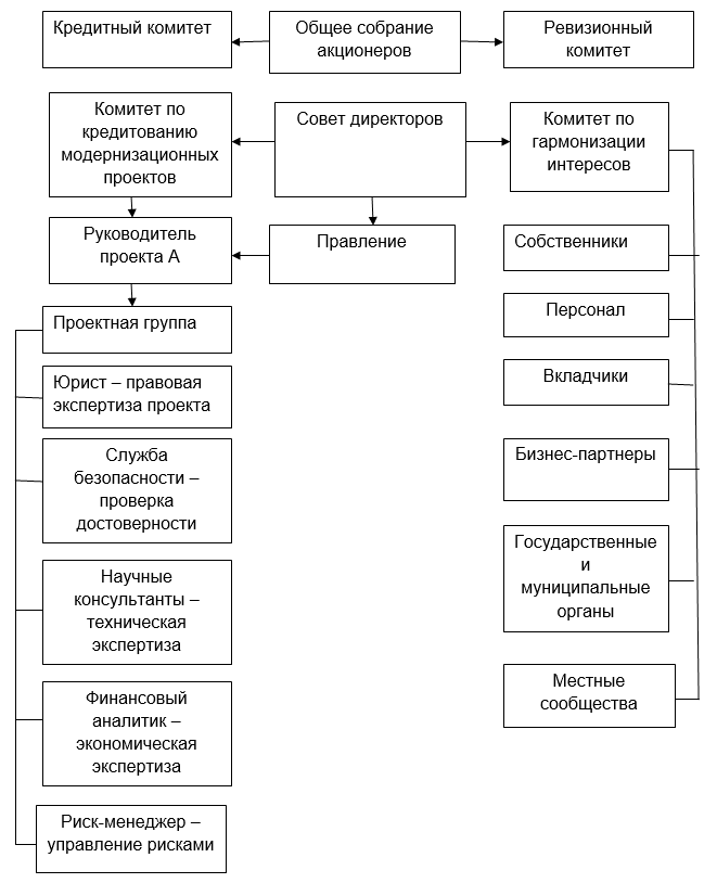 Независимо от того, выберет банк путь финансирования через участие в уставном капитале кредитуемого субъекта, или же прибегнет к классической форме кредитования, новая организационная структура банка позволит ему максимально участвовать в реализации проекта, постоянно контролировать ситуацию и своевременно принимать меры по корректировке проекта или полному прекращению финансирования.