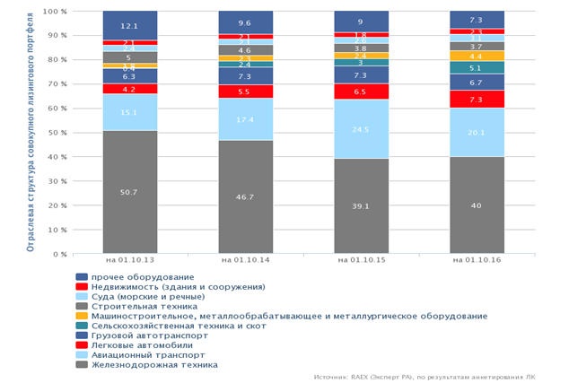 На рынке лизинговых услуг в РФ преобладает лизинг физических активов, доля лизинга недвижимого имущества в лизинговом портфеле небольшая - на 01.10.2016г. составляет 2,3% (график 1).
