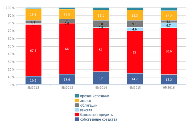 С текущего года отмечается обратная динамика: доля кредитов в структуре финансирования сделок выросла с 55% за 9 месяцев 2015 года до 61% за 9 месяцев 2016 года. Доля облигаций снизилась с 9% до 3% в связи с менее активным использованием этого инструмента крупнейшими компаниями. С 5 до 7% увеличилась доля ценных бумаг, в связи с привлечением средств за счет векселей. Доли авансов и собственных средств не претерпели существенных изменений и составили 12 и 13% от профинансированных средств за январь – сентябрь 2016 года соответственно (график 2).