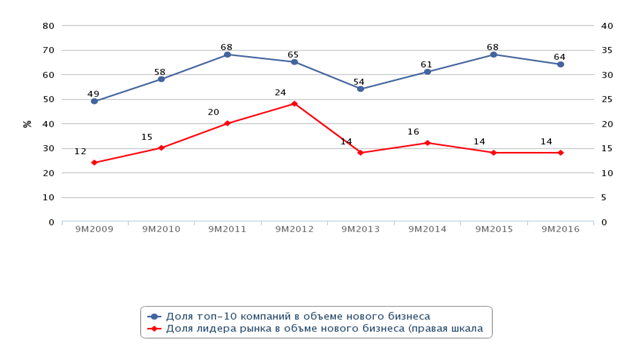 Отраслевой рынок лизинговых услуг России имеет высокую концентрацию - большая его доля приходится на мегаполисы и наличие явных лидеров. Концентрация новых сделок на топ-10 компаний, несмотря на снижение с 68% за январь – сентябрь 2015 года до 62% за аналогичный период 2016 года, остается высокой.