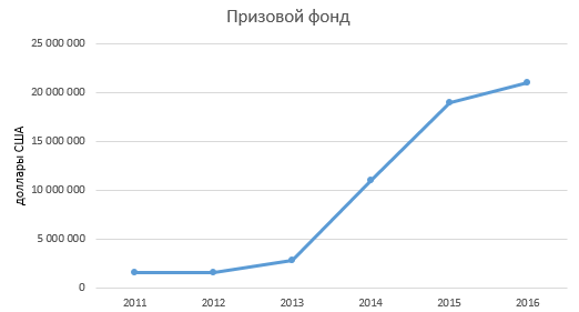 Рисунок 3. Динамика призового фонда соревнований Dota 2 в 2011-2016 гг.