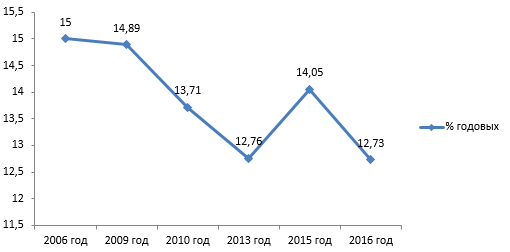 Рисунок 1 – Динамика средних ставок по ипотечным кредитам в России, % годовых (по данным Банка России за июль каждого года)