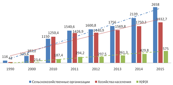 В 2015 году ЛПХ и К(Ф)Х было реализована сельскохозяйственной продукции на сумму 2507,7 млрд.руб.