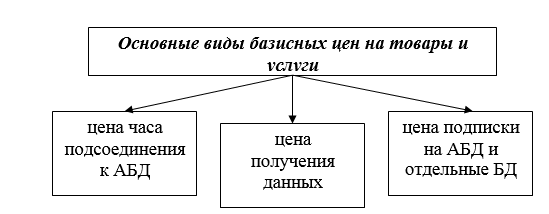 Оплата работы пользователя с АБД регулируется тарифами на интерактивные услуги и системой льгот и скидок с базисных цен, с целью стимулирования спроса. Основные виды базисных цен приведены на рисунке 2.