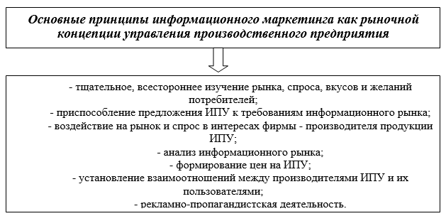 По мере коммерциализации информационной деятельности на неё начинают распространяться общие принципы маркетинга как рыночной концепции управления современным производством, при котором в основе принятия хозяйственных решений лежит рыночная информация, а обоснованность решений проверяется рынком в ходе реализации товаров или услуг. В результате этого возникает информационный маркетинг, или маркетинг ИПУ [3].