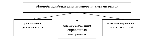 Для получения доступа к АБД пользователь должен заключить контракты с интерактивными службами. По заключении контракта пользователю открывается доступ ко всем БД, содержащимся в АБД, либо к некоторым из них (если требуется подписка на БД). Пользователь получает идентификатор и пароль. По итогам работы пользователя в течение определенного календарного периода (как правило, месяца) выставляется счёт, подлежащий оплате, пользователь получает его расшифровку, отражающую характер работы с АБД в данном периоде. Своевременное и правильное выставление счетов обеспечивается специально разрабатываемыми подсистемами в составе программных средств АБД - подсистемой сбора и анализа статистики использования АБД и подсистемой расчетов с пользователями. Методы продвижения интерактивных услуг на рынок приведены на рисунке 3. Рекламирование интерактивных услуг производится в целях информирования пользователей о характеристиках конкретных БД и АБД и о преимуществах, которые получат пользователи в результате работы с ними.