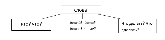 Второй класс, согласно школьной программе, включает проведение классификации слов с учетом морфологического вопроса, на который они отвечают. При изучении частей речи во втором классе получили кластер такого вида: