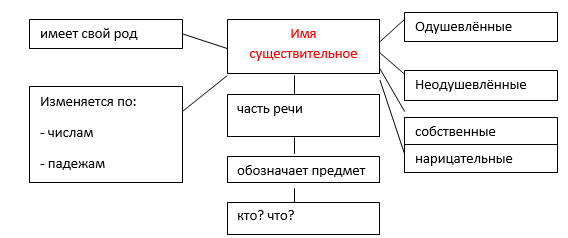 Третий класс является центральным в формировании понятия «часть речи». Учащиеся знакомятся с совокупностью лексико-грамматических признаков, свойственных каждой части речи: роль в языке, обобщенное лексическое значение, категория рода, числа, времени (у глаголов)- функция в предложении. В третьем классе кластеры строятся на каждую часть речи отдельно. Лист ватмана размещается на второй половине доски. Посередине этого листа записываю часть речи, которую мы начали изучать. Новое звено в кластере появляется с каждой новой изученной темой, которое становится итогом пройденного урока. Например: при изучении на уроке темы «Изменение имён существительных по числам» в конце урока дети добавляют кластеру имени существительного звено «Изменяется по числам». С каждым пройденным уроком кластер нарастает. Лист висит на доске до тех пор, пока не будет пройдена вся грамматическая тема. Затем получившийся кластер вывешивается на видное место в качестве наглядного материала. По этой же схеме составляется кластер на следующую изучаемую часть речи.