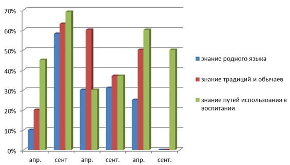 На подготовительном этапе (апрель – май 2007г.) была проведена беседа с целью выявления уровня знаний родного языка, традиций и обычаев своего народа, их использования в воспитании детей.