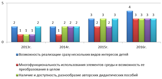 - 2013г. (7 баллов) – удовлетворительный уровень создания интерактивной предметно-игровой среды, который, однако, сопровождается недостаточным использованием элементов среды и непредставлением детям возможностей для ее преобразования, наличием небольшого количества интерактивных и авторских дидактических пособий или их отсутствием;