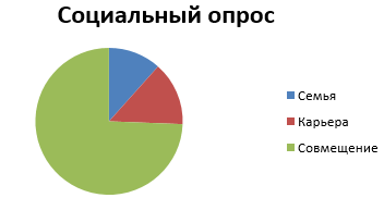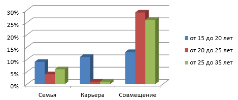 По данному исследованию мы видим, что большинство респондентов за совмещение семьи и карьеры, но тем не менее более молодое поколение (от 15 до 20) активно выбирают карьерный рост 11 %, в данной возрастной группе а также есть те, кто смело выбирает семейную жизнь 9 %. Мы привели более высокие результаты. Это нам говорит о том что у молодых тоже идет некое разделение семьи и карьеры, этот вопрос всегда останется открытым, в любое время. В общем процентном соотношение диаграмма выглядит следующим образом на Рисунке 2: