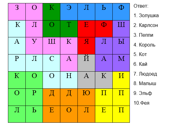 В ходе развития учебной мотивации второклассников, мы разработали дидактическую игру по сказкам зарубежных писателей с помощью словесной головоломки – Филворд. Дидактической задачей игры является проверка знаний имён героев сказок зарубежных писателей. Игровая задача – найти в сетке филворда заданные слова. Буквы не должны пересекаться. Правила игры: дети по поднятой руке выходят к доске и выделяют слово, которое нашли.