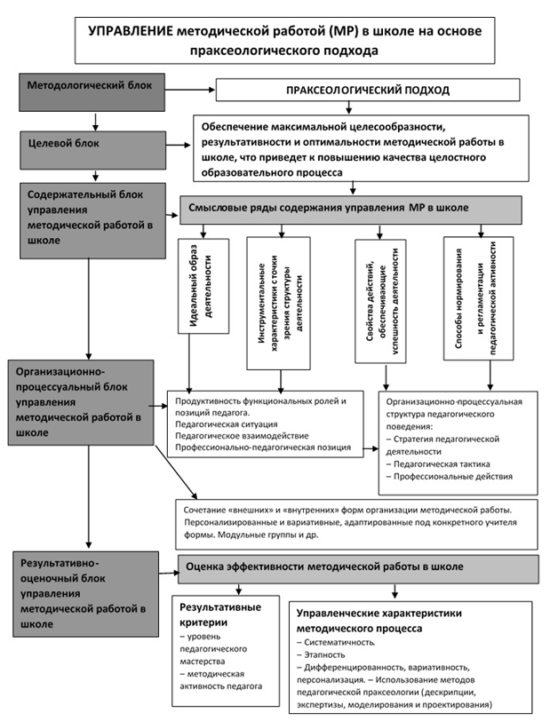 В основе всей модели лежит методологический блок. Основным методологическим компонентом данного блока является праксеологический подход, который и определяет основные требования к управлению методической работой.