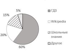 Мы провели исследование среди учеников 7-9-х классов и преподавательского состава МБОУ СОШ с УИОП № 60 г. Кирова. Установлено: опрошенные ученики практически всегда используют интернет-ресурсы для подготовки домашнего задания, наибольшей популярностью пользуются такие сайты, как «Wikipedia», «Школьные знания», а также, различные сайты с готовыми домашними заданиями (рис. 1).