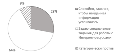 Подобный способ подготовки может не только оставить пробелы в знаниях, но и ввести в заблуждение или привести к эффекту «информационной передозировки», т.к. большинство материала, представленного в интернет-энциклопедиях, подросток чаще всего не может понять и усвоить самостоятельно из-за большого количества не нужной и не понятной, на данном этапе обучения, информации. Примерно четверть опрошенных учителей спокойно относятся к тому, что ученики используют интернет для подготовки домашнего задания. Для них главное, чтобы вся найденная информация «хорошо усваивалась» (в большинстве это молодые учителя, чей педагогический стаж составляет менее 5 лет, рис. 4).