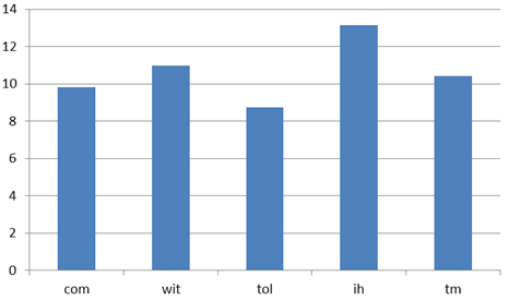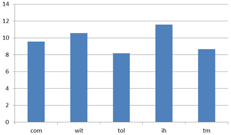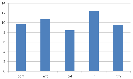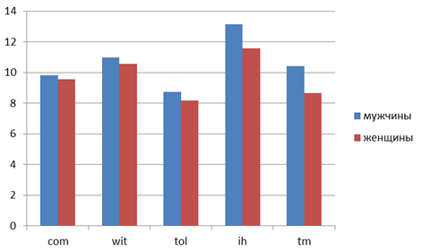 Анализируя результаты Таблицы 4 и Гистограммы 4 можно сделать вывод о том, что мужчины более подвержены проблемам, связанным со здоровьем и внутриличностным конфликтом (шкала IH), чем женщины. Также мужчины имеют большие трудности с контролем времени, нежели женщины.