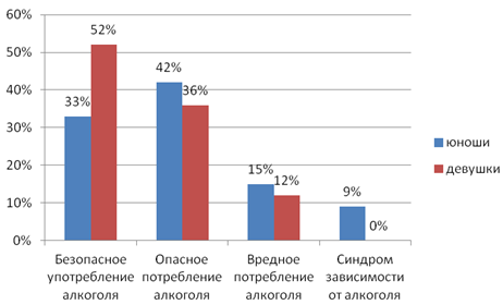 У юношей, в свою очередь, наиболее выраженным оказался уровень опасного потребления алкоголя (42%). Исходя из этого, можно говорить о высоком риске будущего ущерба здоровью, появлению некоторых трудностей в социальной сфере (домашние ссоры, опоздания на учёбу, пропуски занятий, конфликты на работе). Тем не менее, алкогольная зависимость у них ещё не сформирована.