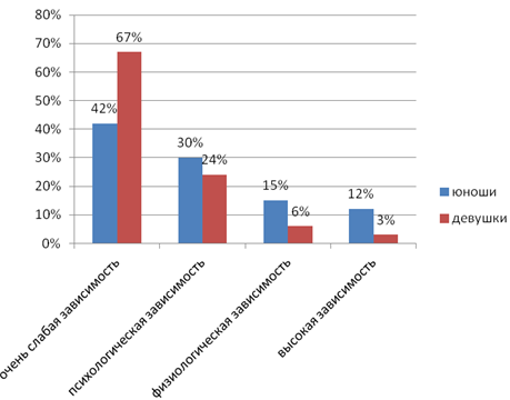 Большинство юношей (42%) и девушек (67%), по данным нашего исследования, имеют очень слабую никотиновую зависимость, либо не курят вообще.