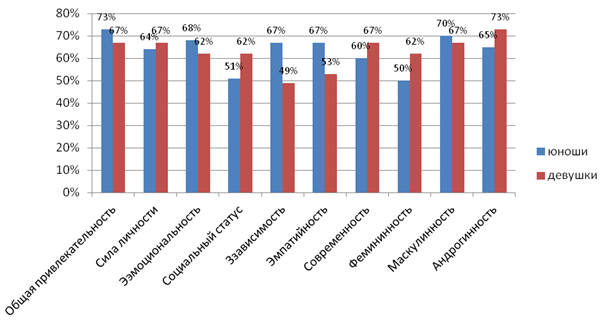 Фемининность, то есть наличие традиционных женских качеств, в нашей выборке в среднем составила 50% у юношей и 62% у девушек. Андрогинные же, или гендерно нейтральные качества, составили 65% у юношей и 73% у девушек. То есть, можно сказать, что у девушек наиболее выраженной оказалась андрогинность. В своём характере они сочетают и традиционно женские и традиционно мужские качества. Так же, важно отметить тот факт, что по критерию маскулинности у мужчин и женщин не было выявлено значимых различий.
