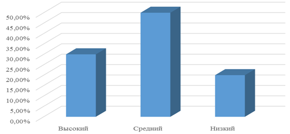 Таким образом, всего 30,0% имеют высокий уровень развития произвольности поведения, средний уровень выявлен у 50,0% старших дошкольников и 20,0% детей отличает наличие низкого уровня развития произвольности поведения.