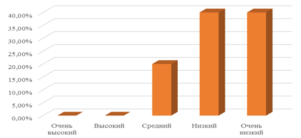 3. Низкий уровень развития упорства, целеустремленности и самоконтроля имеет место у 40,0% детей, соответственно 40,0% старших дошкольников характерен очень низкий уровень развития упорства, целеустремленности и самоконтроля.