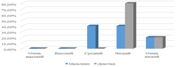 Таким образом, основная часть детей имеют низкий и очень низкий уровни развития упорства, целеустремленности и самоконтроля.