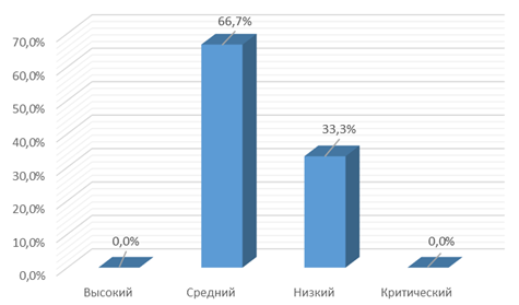 Констатирующий эксперимент показал, что в экспериментальной группе дети с высоким и критическим уровнем развития чувства ритма отсутствуют; 66,7% – дети со средним уровнем; 33,3% – дети с низким уровнем (Рис.1).
