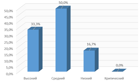 В контрольной группе при обследовании были получены следующие результаты: 33,3% – дети с высоким уровнем, 50%– дети со средним уровнем, 16,7% – дети с низким уровнем; дети с критическим уровнем развития чувства ритма отсутствуют (Рис 2).