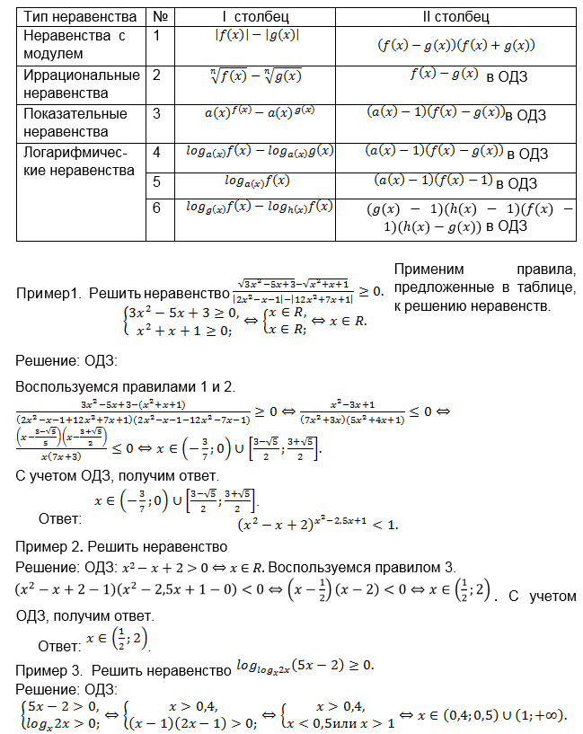 Эти методы не относятся к стандартным школьным, но позволяют многие неравенства решать быстро и красиво, сводя их решение к классическому варианту метода интервалов. В школьном курсе алгебры и математического анализа эти методы не изучаются, но знание их позволяет упростить решение многих неравенств, уменьшить время решения, что особо важно на Едином государственном экзамене.