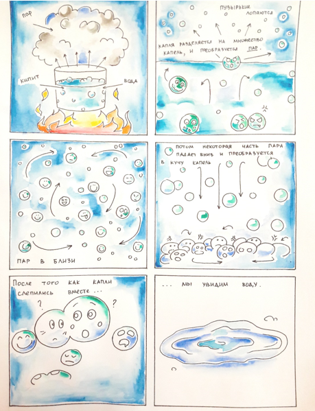 Нами разработан комикс по теме «Испарение и кипение» для учащихся 8 класса. На рисунках дается пояснение о способе преобразования пара, и о том как может он обратно превратится в воду. Нами выбраны реалистичные цвета рисунков, заключающуюся в установлении аналогии между окраской изображений и цветом изображаемых предметов в действительности. Чем более реалистична цветовая гамма произведения, тем лучше оно укладывается привычную картину мира ребенка. Преобладание реалистичности в комиксе может рассматриваться как средство снятия трудностей в процессе интерпретации.