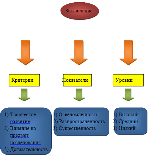 Структура модели по проблеме исследования состоит и трех этапов: подготовительный, основной и заключительный. В подготовительном этапе показано, что было нами изучено, литература какого рода была рассмотрена, каким темам было уделено значительное внимание и какие понятия рассматриваются в работе. В основном этапе были рассмотрены конкретные авторы (Л.С.Выгодский, В.В. Давыдов, И.С. Якиманская), были проанализированы и осмыслены их теории в контексте работы. В третьем этапе были рассмотрены критерии, показатели и уровни научной работы. В целом, модель создана для того, что бы помочь в исследовании, систематизировать план работы и обратить внимание на то, что нуждается в исследовании в большей степени. Модель работы в данном случае является планом, которому необходимо следовать для реализации целей, которые преследует научная работа.