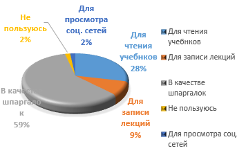 Большинство студентов пользуются гаджетами в качестве шпаргалок, что является большим минусом. И только 37% студентов пользуются гаджетами во время занятий для учебных целей. Не пользуются гаджетами только 2%.
