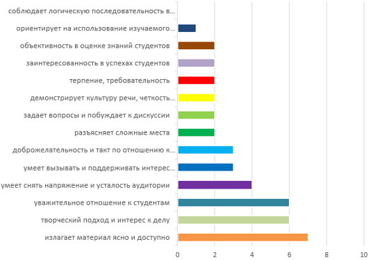 Самые частотные ответы, как мы видим, «Излагает материал ясно и доступно», «Творческий подход и интерес к делу», «Уважительное отношение к студентам».