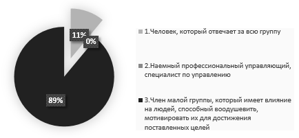 Первый вопрос, который был задан респондентам: «По вашему мнению лидер – это…» из них 89% ответили, что лидер - это член малой группы, который имеет влияние на людей, способный воодушевить, мотивировать их для достижения поставленных целей.