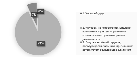 Следующий вопрос, который был задан респондентам: «По вашему мнению руководитель – это…», из них 93% ответили, что руководитель – это человек, на которого официально возложены функции управления коллективом и организации его деятельности.