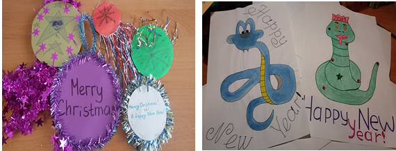 В канун нового года, по окончании второй четверти, мы делаем проект «Новогодняя открытка». Данную открытку дети подписывают на иностранном языке и дарят своим родителям или друзьям. Так же иногда на последних уроках перед Новым годом мы делаем проект с символом Нового года, ребята изображают символ наступающего года и готовят сообщение к своему рисунку.
