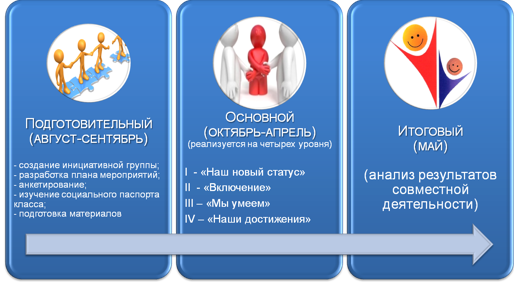 Проект рассчитан на учащихся 1-го класса и их родителей. Реализация проекта предусматривает три этапа, схематически представленных на рисунке 2.
