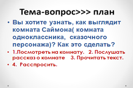 Тема урока формулируется в виде вопроса. Учащимся необходимо построить план действий, чтобы ответить на поставленный вопрос. Дети выдвигают множество мнений, чем больше мнений, чем лучше развито умение слушать друг друга и поддерживать идеи других, тем интереснее и быстрее проходит работа.