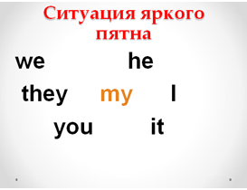 Среди множества однотипных предметов, слов, цифр, букв, фигур одно выделено цветом или размером. Через зрительное восприятие внимание концентрируется на выделенном предмете. Например, предлагаю слова: I, He, My, You, We. Слово «My» выделено цветом. Совместно определяется причина обособленности и общности всего предложенного. Далее определяется тема и цели урока.