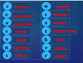 В начале урока дети отгадывают тему урока, заполняя пропущенные буквы в изученных словах. Буквы в ключевых словах появляются в процессе заполнения пропусков. Тема: «Сезоны и погода»