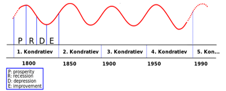 Самым значимым достижением советского экономиста Н. Кондратьева (1892 - 1938 гг.) считается теория больших циклов экономической конъюнктуры, известных как «длинные волны» Кондратьева, разработанная им в 1920-е гг. на основании анализа статистических данных из истории экономики США, Великобритании, Франции, Германии и некоторых других стран за период с конца XVIII по начало XX в. Учёный рассмотрел ряд показателей, включая номинальную заработную плату, цены на потребительском и инвестиционном рынках, процент на капитал, объёмы добычи и потребления угля, производства чугуна и свинца, внешнеторговый оборот и т. д. [1], и выявил ряд циклов, также известных как К-волны (см. рис. 1).